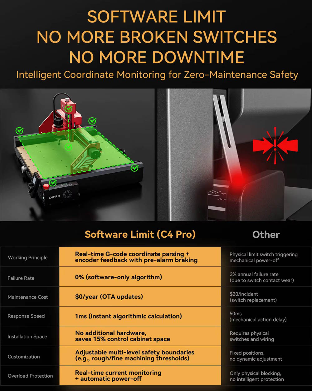 Limite logicielle : Le logiciel avertit l’utilisateur du risque de dépassement de la zone de travail et vérifie la validité du programme d’usinage, rendant le travail plus sûr et plus confortable.