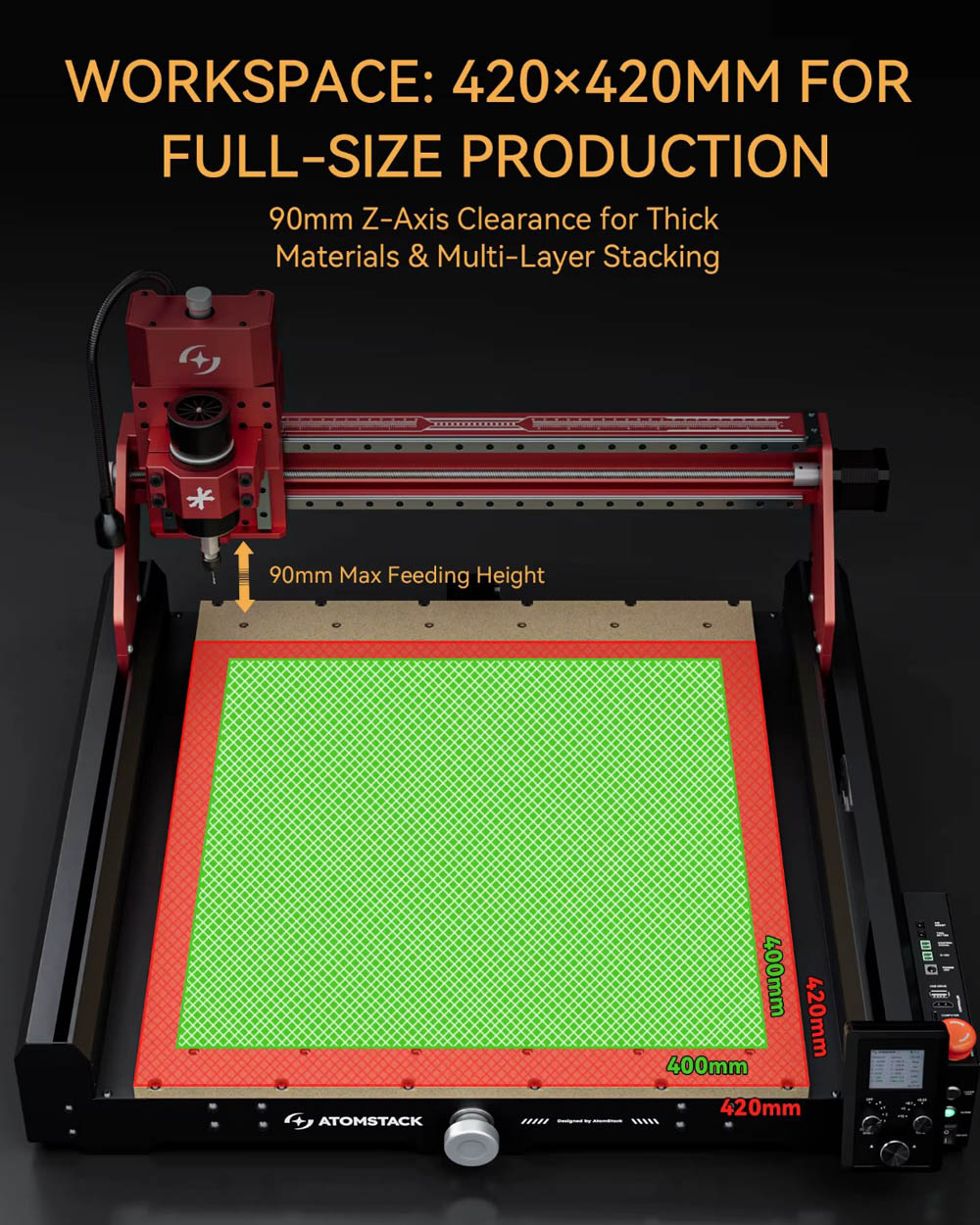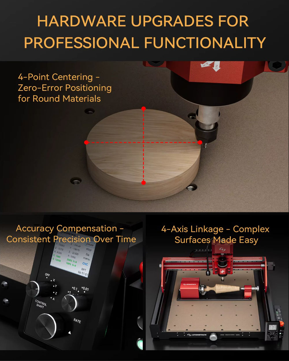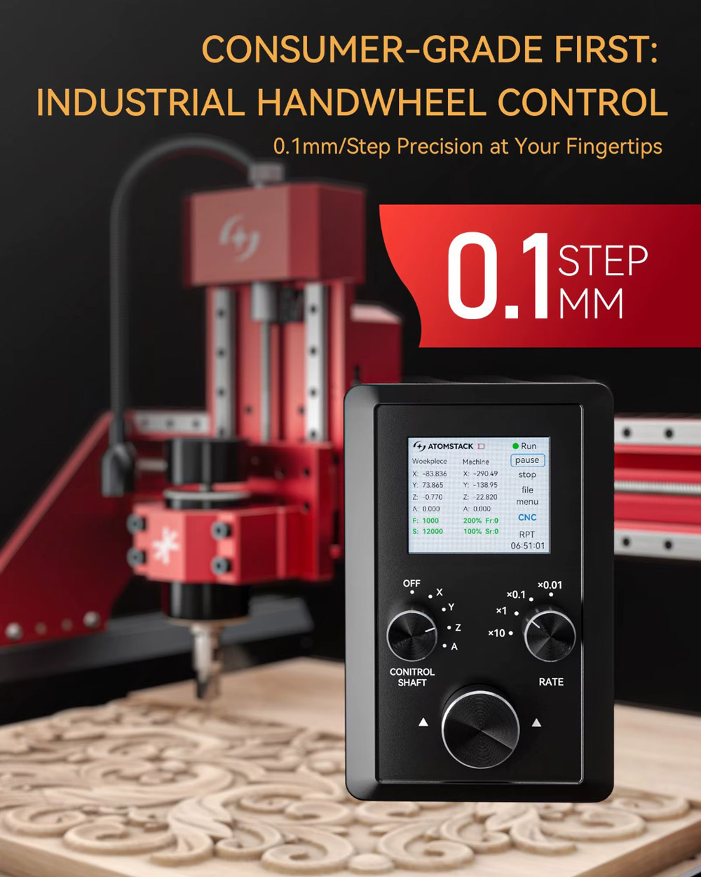 Commande hors ligne de niveau industriel : L’AtomStack C4 Pro est équipée d’un contrôleur hors ligne industriel propriétaire avec molette. Il permet d’observer et de corriger la position, ainsi que de surveiller l’état de la broche à courte distance – pour une expérience digne des machines industrielles.
