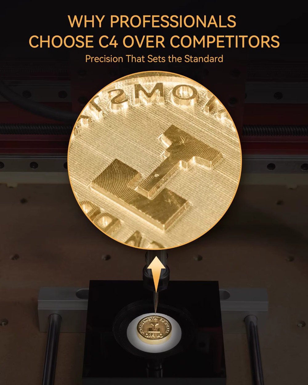 Construction robuste : Des guides linéaires MGH12 et des vis T8 à double écrou sont utilisés sur les axes X et Z. L’axe Y est renforcé par un rail linéaire de 16 mm et une vis T12 à double écrou. La C4 Pro est ainsi non seulement précise, mais aussi très durable et capable de supporter de fortes charges. L’appareil atteint une vitesse maximale de gravure de 2000 mm/min, permettant par exemple de graver un tampon en laiton en seulement 15 minutes.