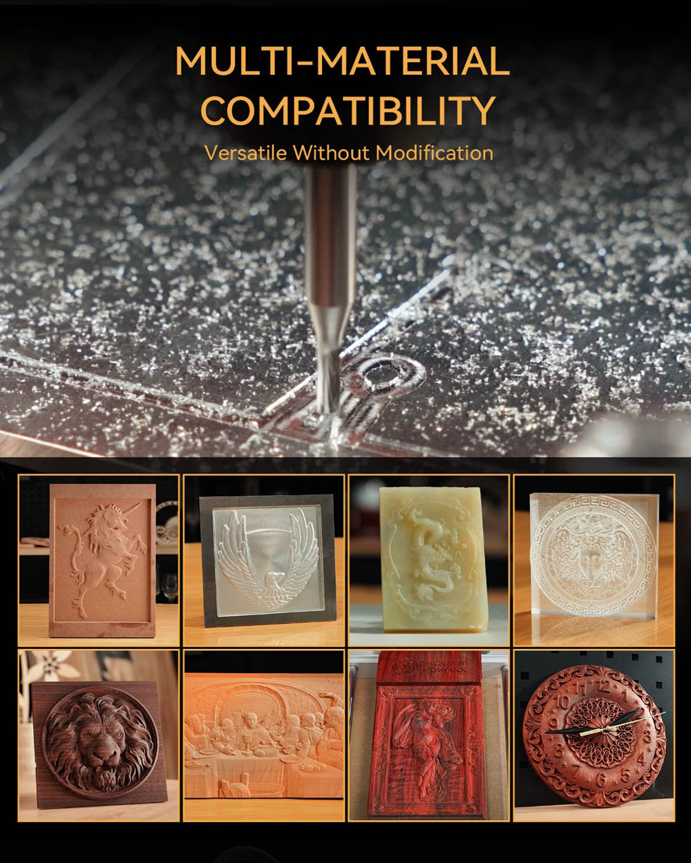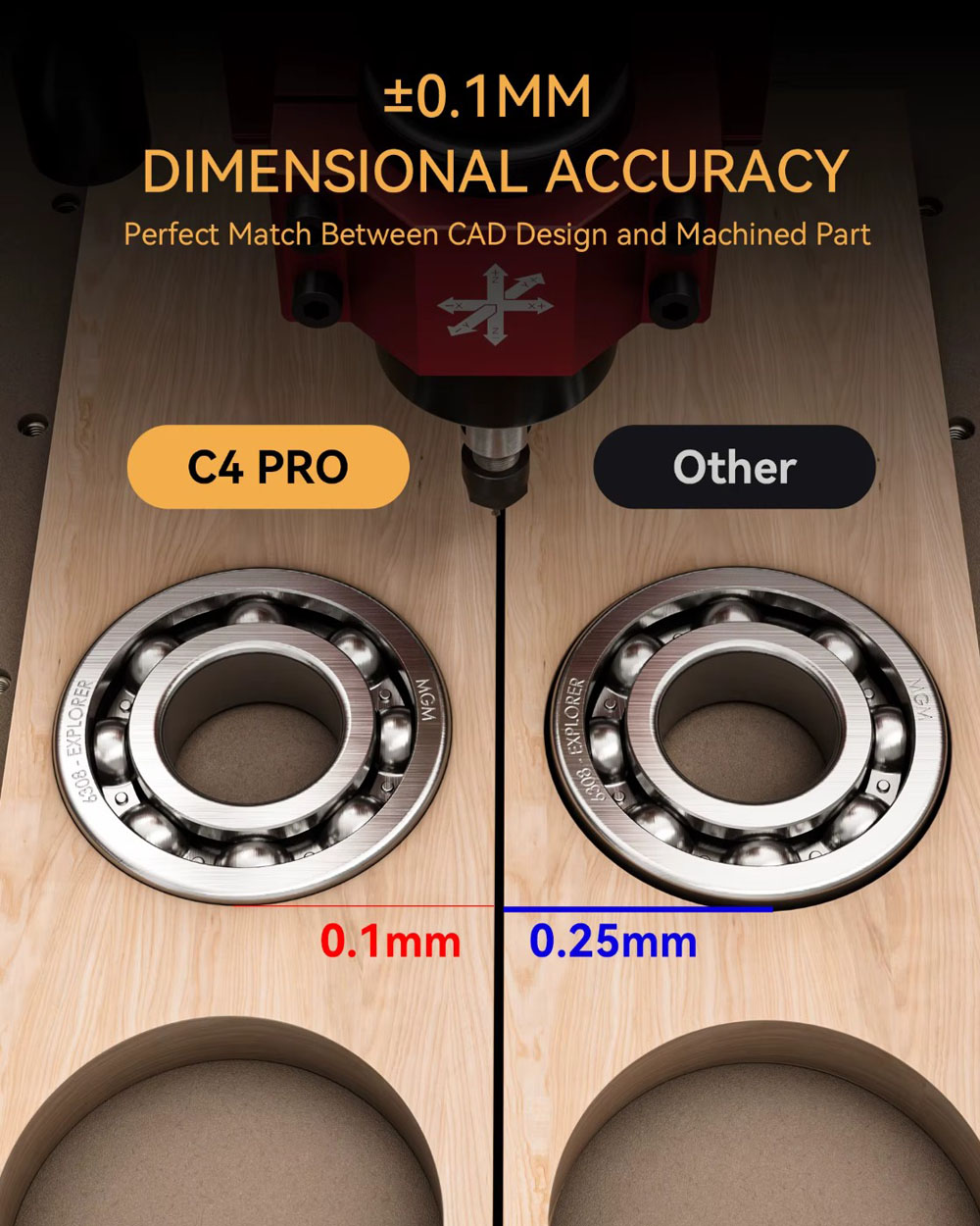 Multiples applications : Grâce à sa construction robuste et à sa broche puissante (jusqu’à 12000 tr/min), la C4 Pro peut usiner sans difficulté divers matériaux comme plastique, aluminium, laiton, bois, PVC, POM, PCB et autres. Idéale pour le travail du bois, l’usinage de PCB, la gravure de tampons métalliques ou la découpe d’acrylique.