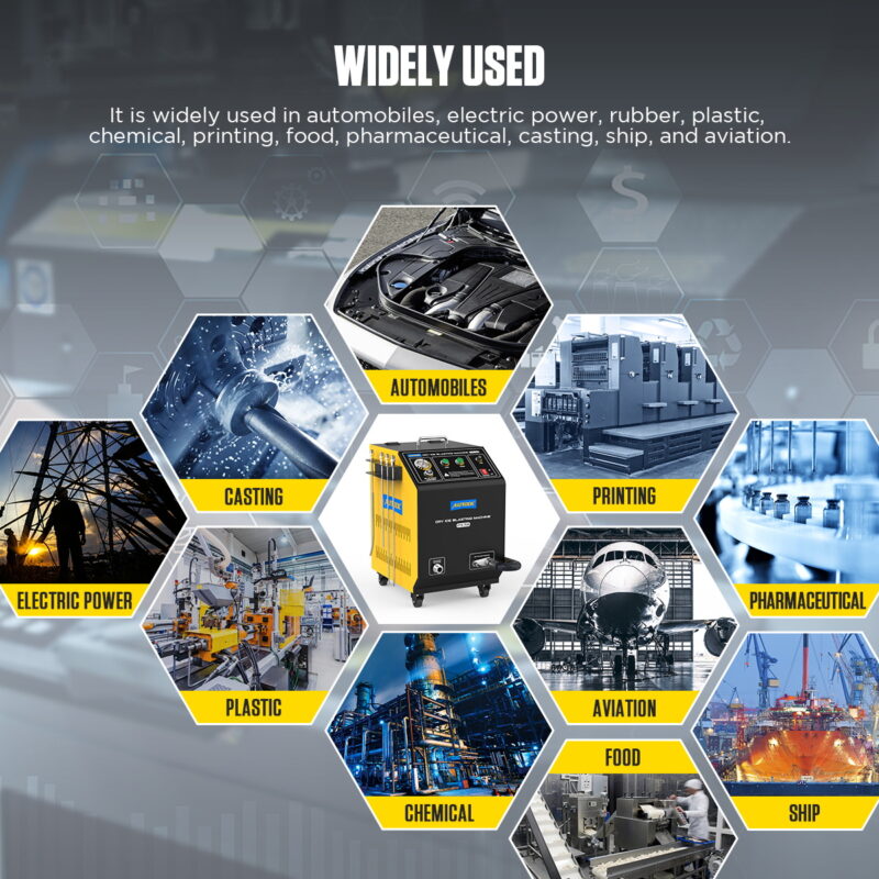 Automobile : Élimination précise de la calamine des soupapes d'admission, des chambres de combustion, des têtes de pistons et des turbocompresseurs sans démontage complet du moteur. Idéal pour le nettoyage des boîtes de vitesses, des éléments de suspension et des compartiments moteur sans risque pour l'électronique fragile.